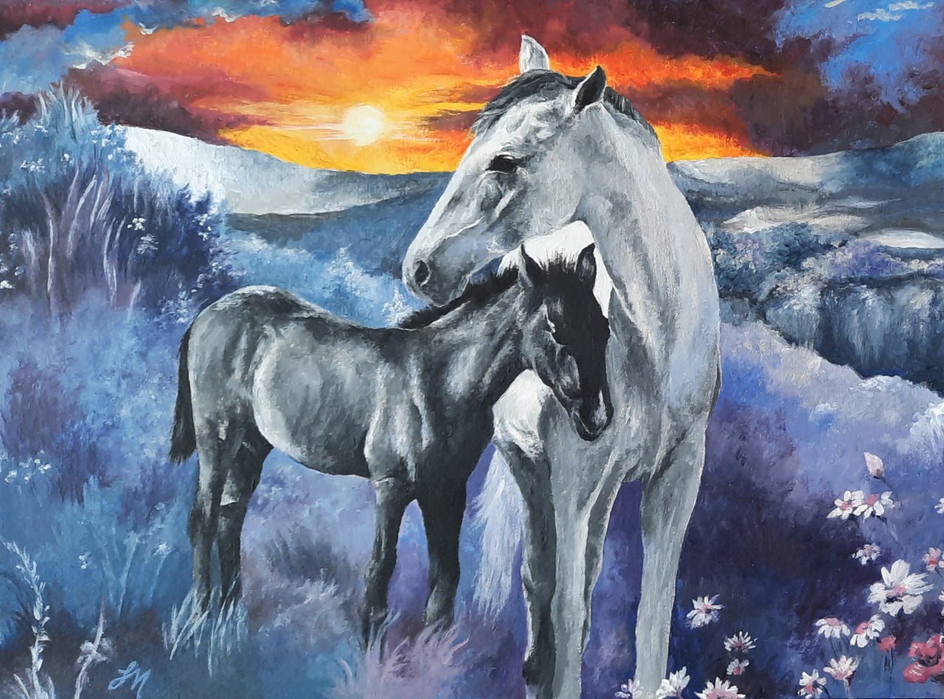 Combining realism with semi abstract splashes of spirit and colour.